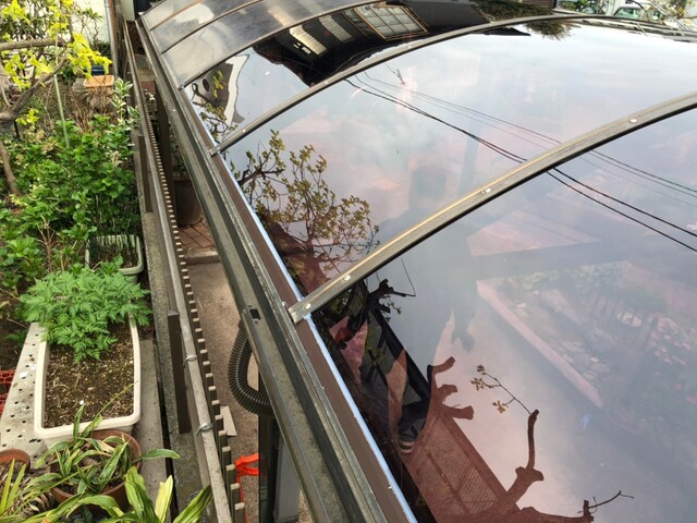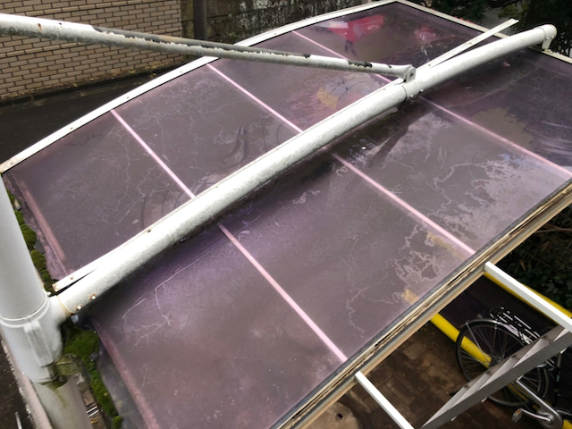 古くなったアクリル板を取り外し、新たなポリカ屋根を設置しています。