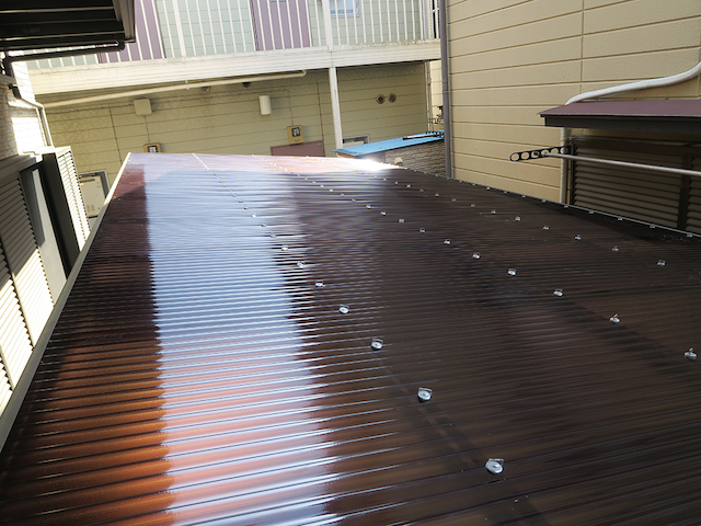 ブラウンエンボスの波板によって、新しく綺麗な屋根になりました。